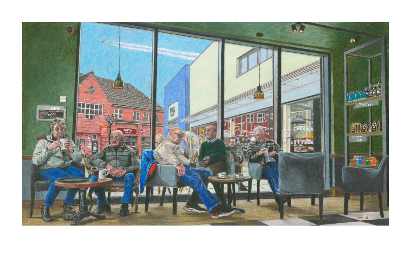 "The Last Cuppa" (50cm x 28cm) coloured pencil on Shore & Marsh mixed media paper. Detail shown (below)